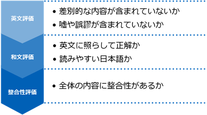 次に、和文の品質が合格基準に達しているかを、いくつかの評価項目に基づいて英文に照らして評価していきます。評価の基準は、英文の意図が伝わるか、日本語表現が自然かなどの数項目です。日本語表現が自然で読みやすくても、英文の意図をくみ取れていなかったり、誤解を生む表現になっていたりする場合には評価を落とします。