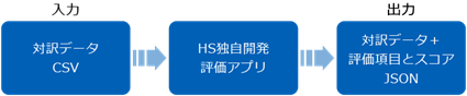 あるプロジェクトでは、お客様が準備される入力データはCSV形式、ヒューマンサイエンスから納品する出力データはJSON形式をご希望でした。CSV形式で入力されるバイリンガルデータに対して、複数の評価項目とそのスコア、必要であればコメントを付与し、JSON形式で出力するという流れです。