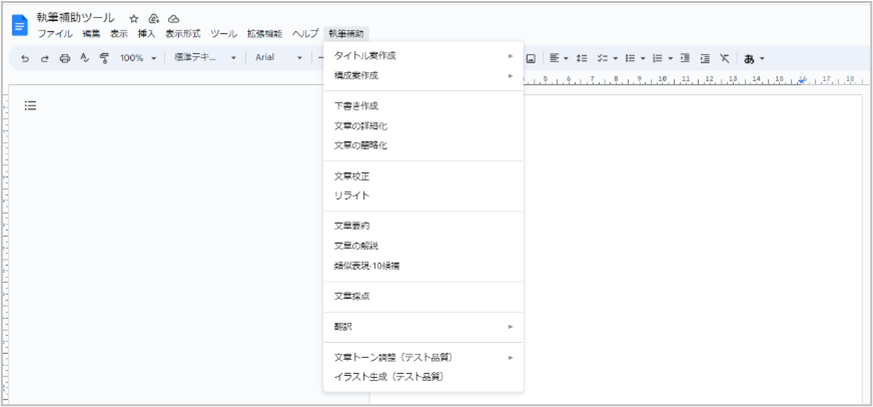 The writing assistance tool is a Google Docs plugin, with ChatGPT operating on the backend of this tool. This allows you to have generative AI write text directly within the familiar Google Docs environment. Although we broadly call this "writing assistance," we have prepared the following specific menu options.