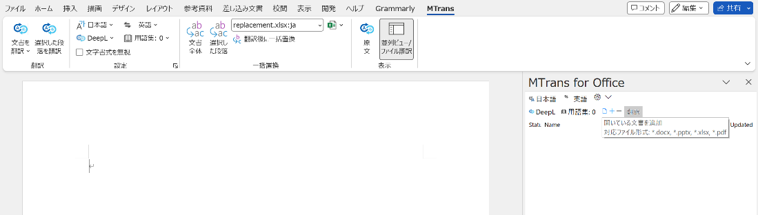 弊社のもう一つの自動翻訳製品のMTrans for OfficeはOutlook、Word、Excel、PowerPointに自動翻訳機能を追加します。このうち、Windows版のMTrans for Office に、DeepLとGoogleを使ったPDF翻訳機能が搭載されており、テキストベースのPDFとスキャンPDFの両方に対応しています。レイアウトを保ったまま翻訳され、編集可能なPDFが保存されます。ファイルサイズの上限は、翻訳エンジンとしてDeepLを使う場合は30MB、Googleを使う場合は20MBです。