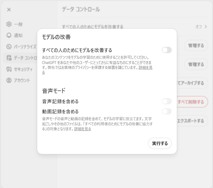 デフォルトでは入力したデータがモデルの改善に使用されます。使用されないようにするには、ウェブブラウザで https://chat.openai.com/#settings/DataControls にアクセスし、「すべての人のためにモデルを改善する」のトグルスイッチをオフにしてください。
