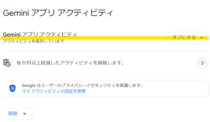 デフォルトでは入力したデータはモデルの改善に使用されます。また、Geminiとのやりとりは人間によって確認される場合もあります。モデルの改善および人間による確認を防ぐには https://myactivity.google.com/product/gemini にアクセスし、「Geminiアプリ アクティビティ」の設定をオフにしてください。