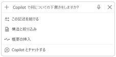 Copilotアイコンをクリック(またはAlt+Iキー)すると「Copilotを使って下書き」ダイアログが表示されます。原稿案を簡潔に入力して「送信」ボタンをクリック(またはEnterキー)すると、その内容を元に文章が生成されます。なお、このダイアログは下書き専用のため、翻訳などの下書き以外の処理をすることはできません。