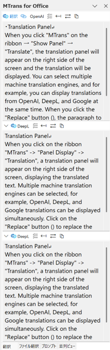 リボンの「MTrans」→「パネル表示」→「翻訳」をクリックすると、画面の右側に翻訳パネルが表示され、訳文が表示されます。複数の機械翻訳エンジンを選択でき、たとえばOpenAIとDeepLとGoogleの訳文を同時に表示することができます。「置き換え」ボタン(⇋)をクリックすると、翻訳対象の段落が訳文に置き換わります。