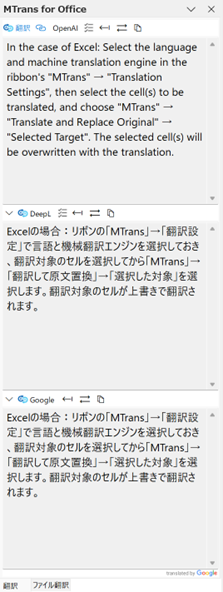 リボンの「MTrans」→「パネル表示」→「翻訳」をクリックすると、画面の右側に翻訳パネルが表示され、訳文が表示されます。複数の機械翻訳エンジンを選択でき、たとえばOpenAIとDeepLとGoogleの訳文を同時に表示することができます。「置き換え」ボタン(⇋)をクリックすると、翻訳対象のセルが訳文に置き換わります。