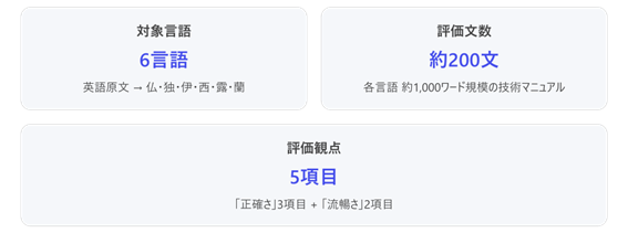 ・対象データ:英語の技術マニュアルをフランス語・ドイツ語・イタリア語・スペイン語・ロシア語・オランダ語に翻訳した対訳データ(各言語 約200文、約1,000ワード)
