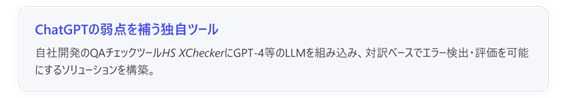 ChatGPTの限界を踏まえ、ヒューマンサイエンスではAIと人間のハイブリッドによる翻訳チェック手法を模索しています。その鍵となるのが、当社独自開発の「HS XChecker」と「LLM校正ツール」の組み合わせです。