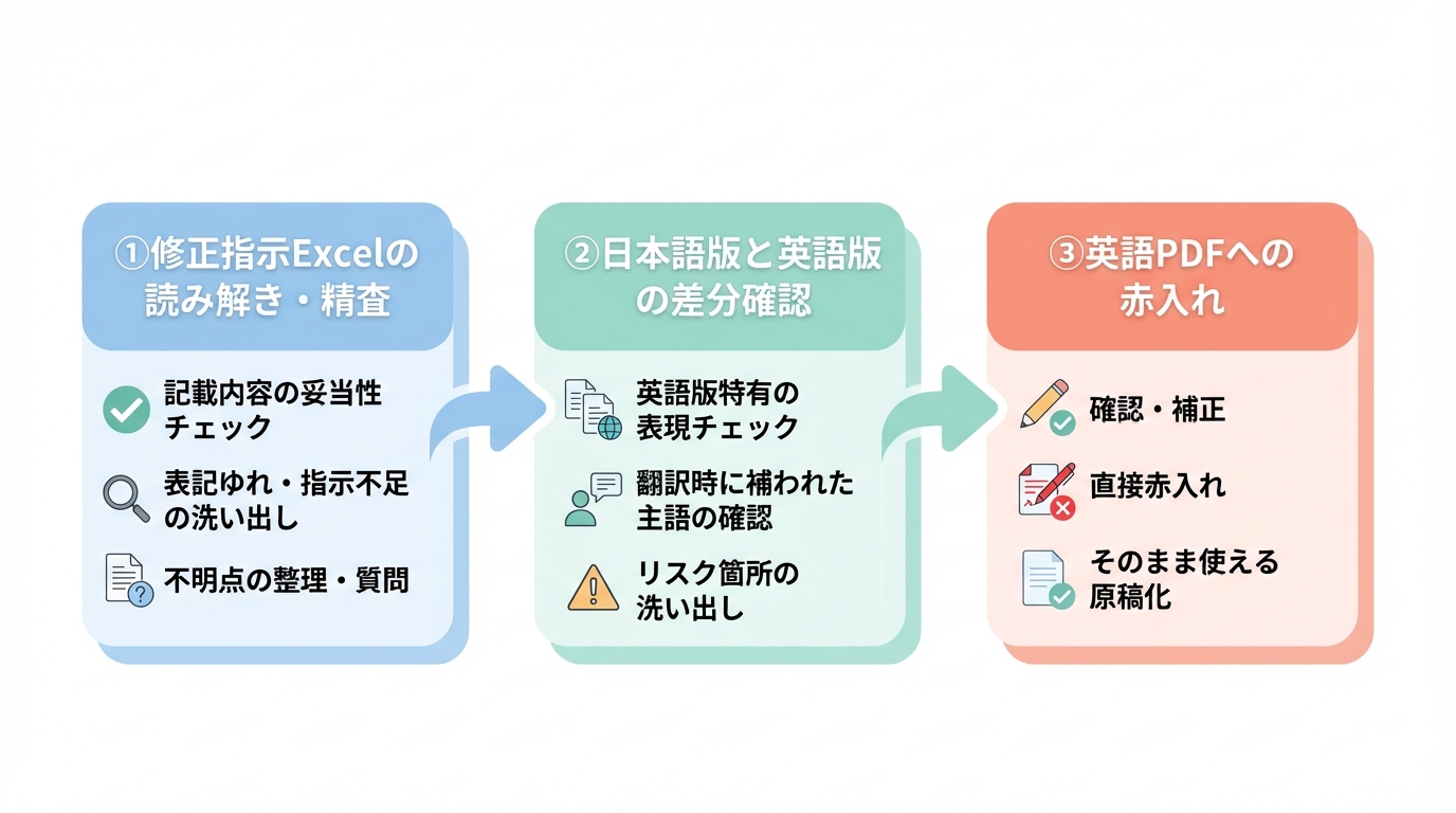 翻訳原稿作成は、単なる差分整理ではありません。「どこが変わるのか」「なぜ変わるのか」「どのように変わるのか」という3つの観点を明確にし、翻訳者・制作担当が迷わない形に落とし込みます。この3点を明確にすることで、指示漏れや解釈違いを防ぎ、翻訳品質の安定と後戻り防止を実現します。