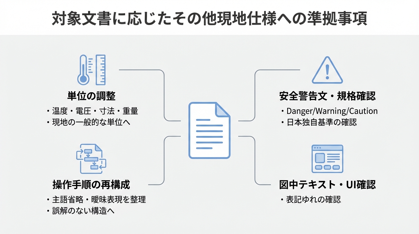 今回の作業内容には含まれませんでしたが、翻訳原稿作成では、文言修正だけでなく、対象国・地域の仕様や慣習に合わせた調整も行います。