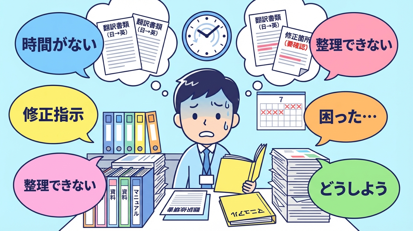 お客様側では、修正点をExcelで整理するのが精一杯で、その内容を英語PDFに落とし込む余裕がありませんでした。また、Excelの内容がそのまま使えるか判断がつかない状態でした。つまり、「翻訳は頼みたいが、その前の準備ができない」という典型的なボトルネックが発生していたのです。
